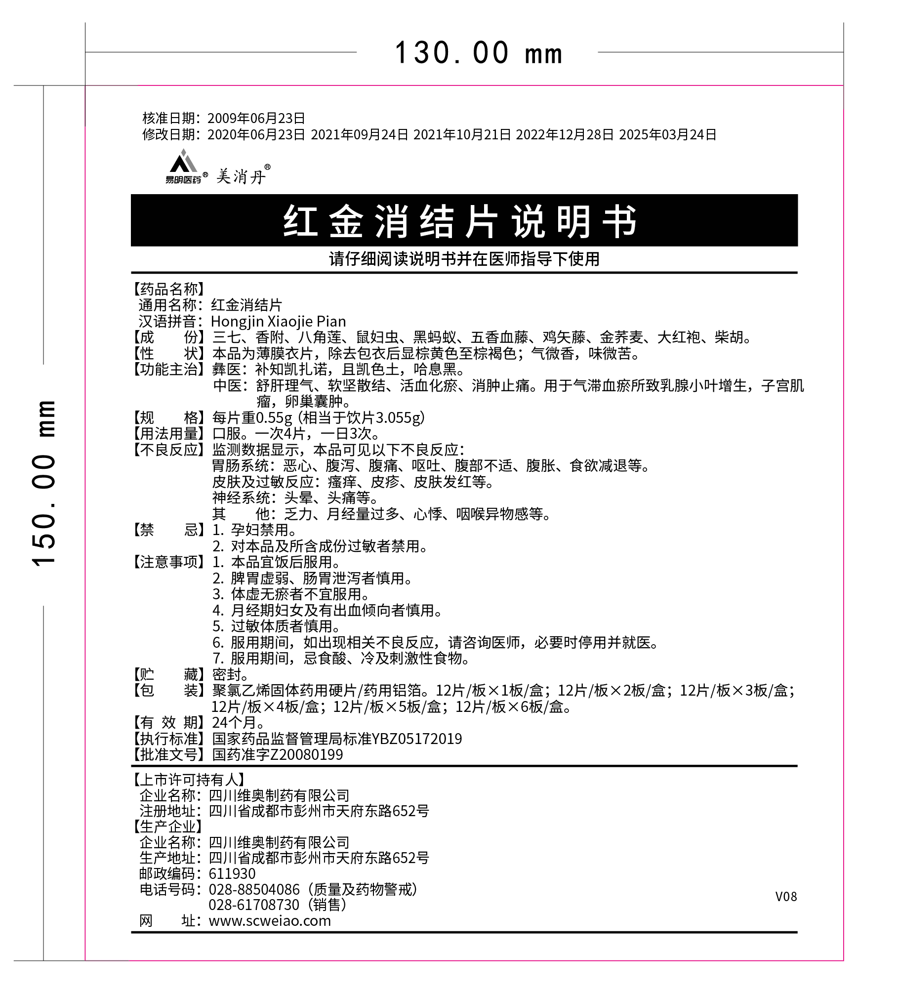 我司对红金消结片说明书(批准文号:国药准字Z20080199)进行修订